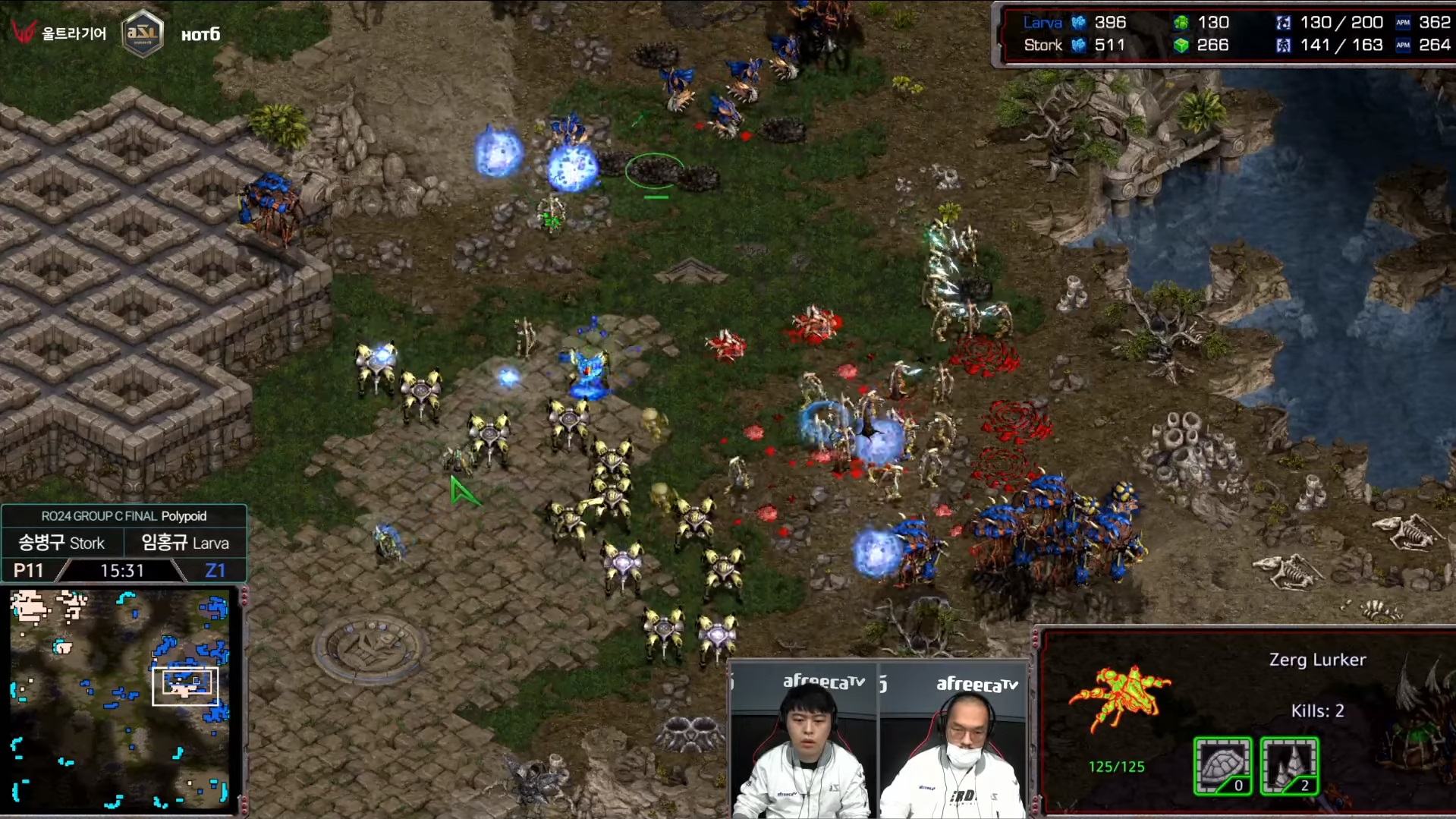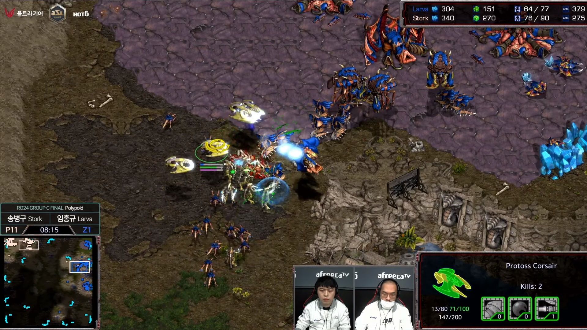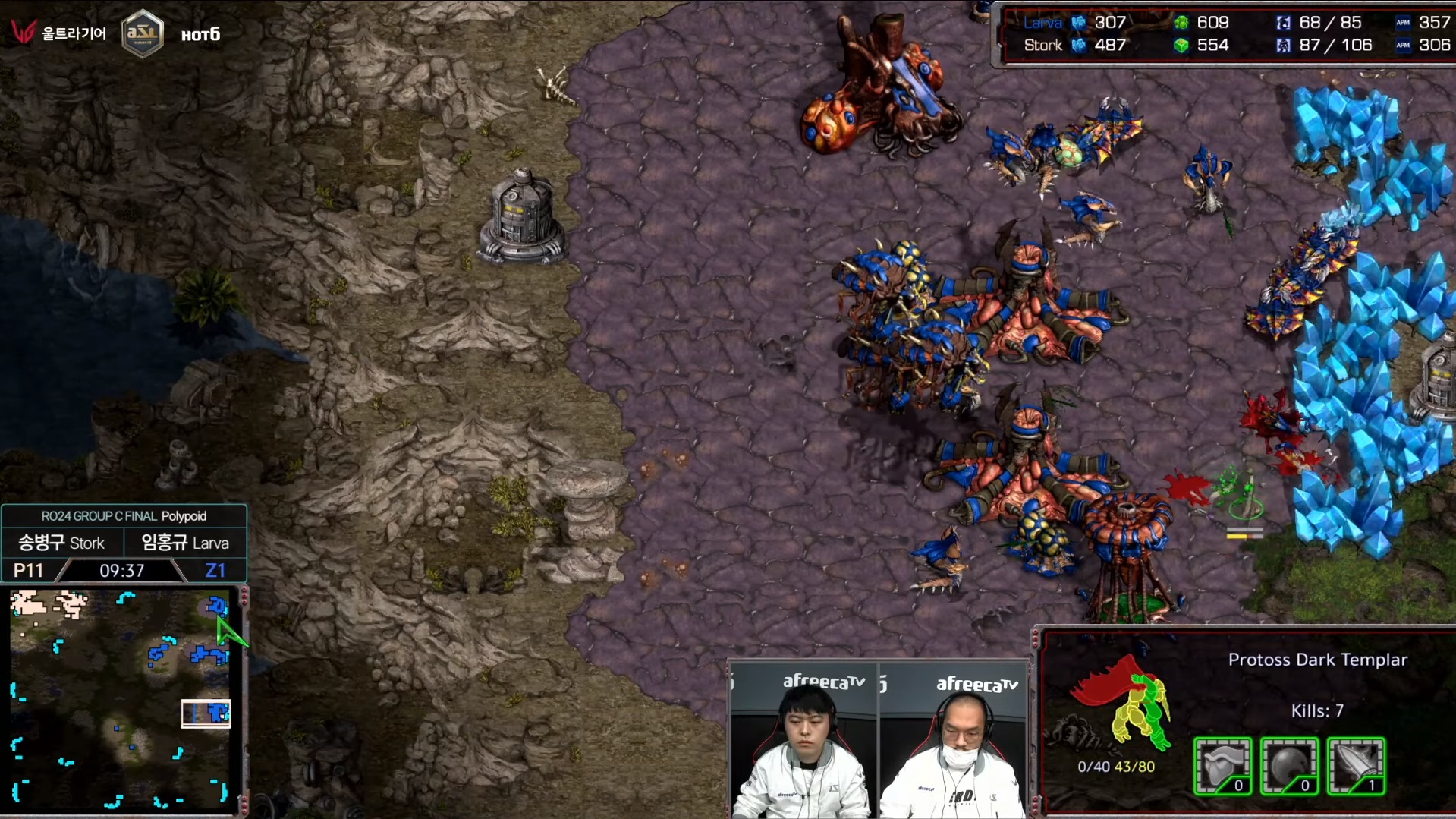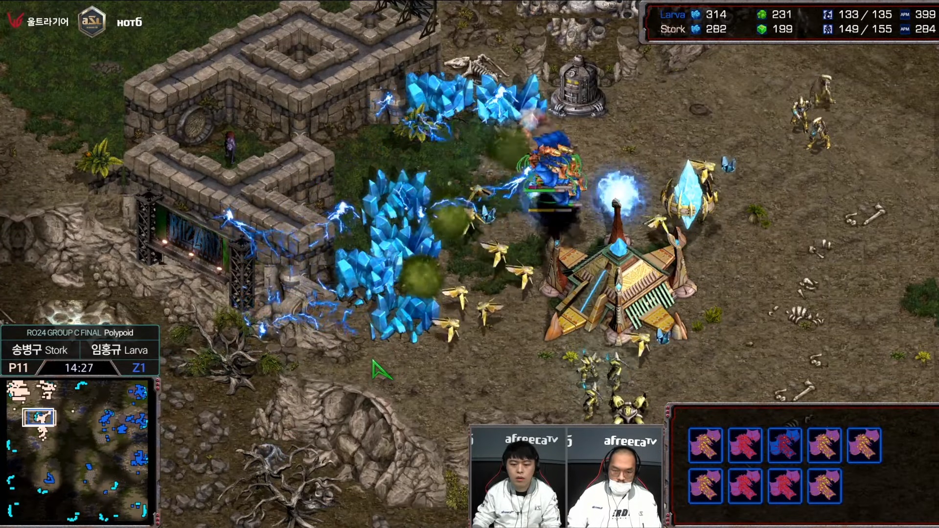 Потеряв армию, Stork полностью развязал руки Лярве, тот еще сильнее отхамил карту и уже обгонял тосса по лимиту. Однако, Аист продолжал бороться.