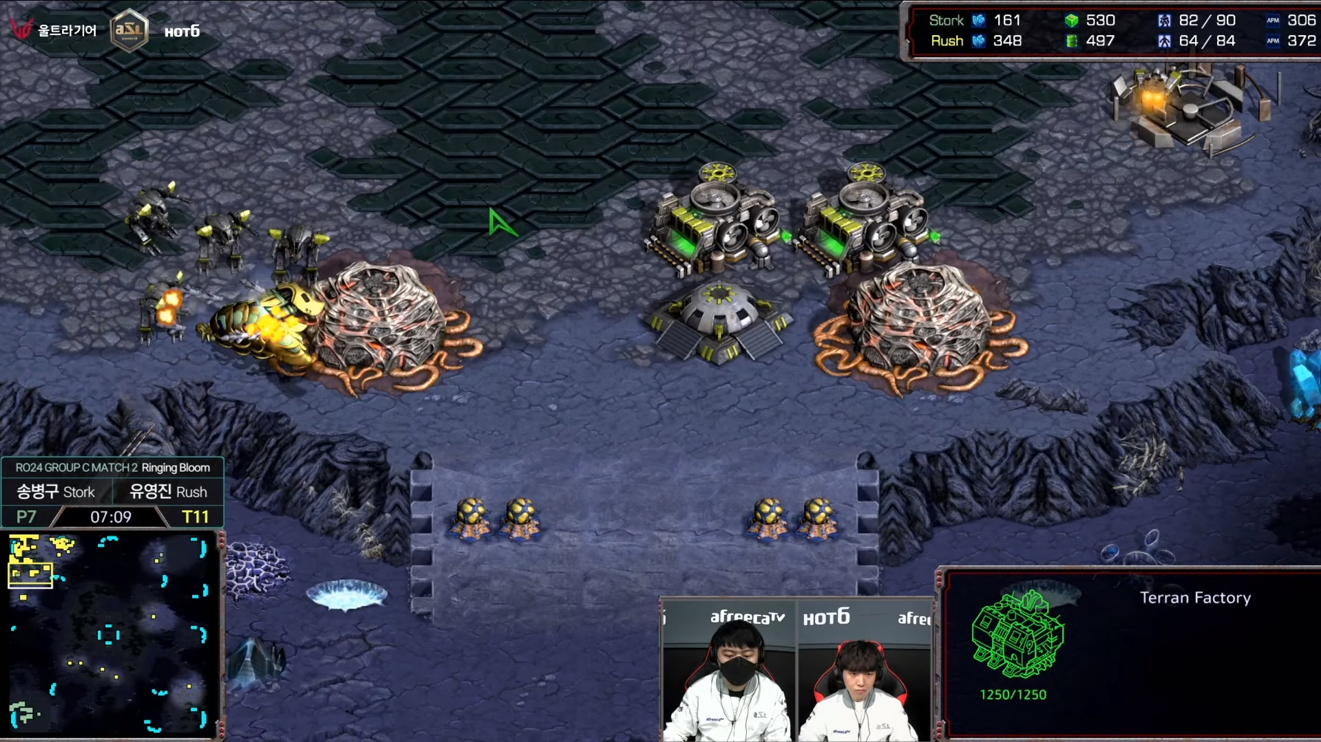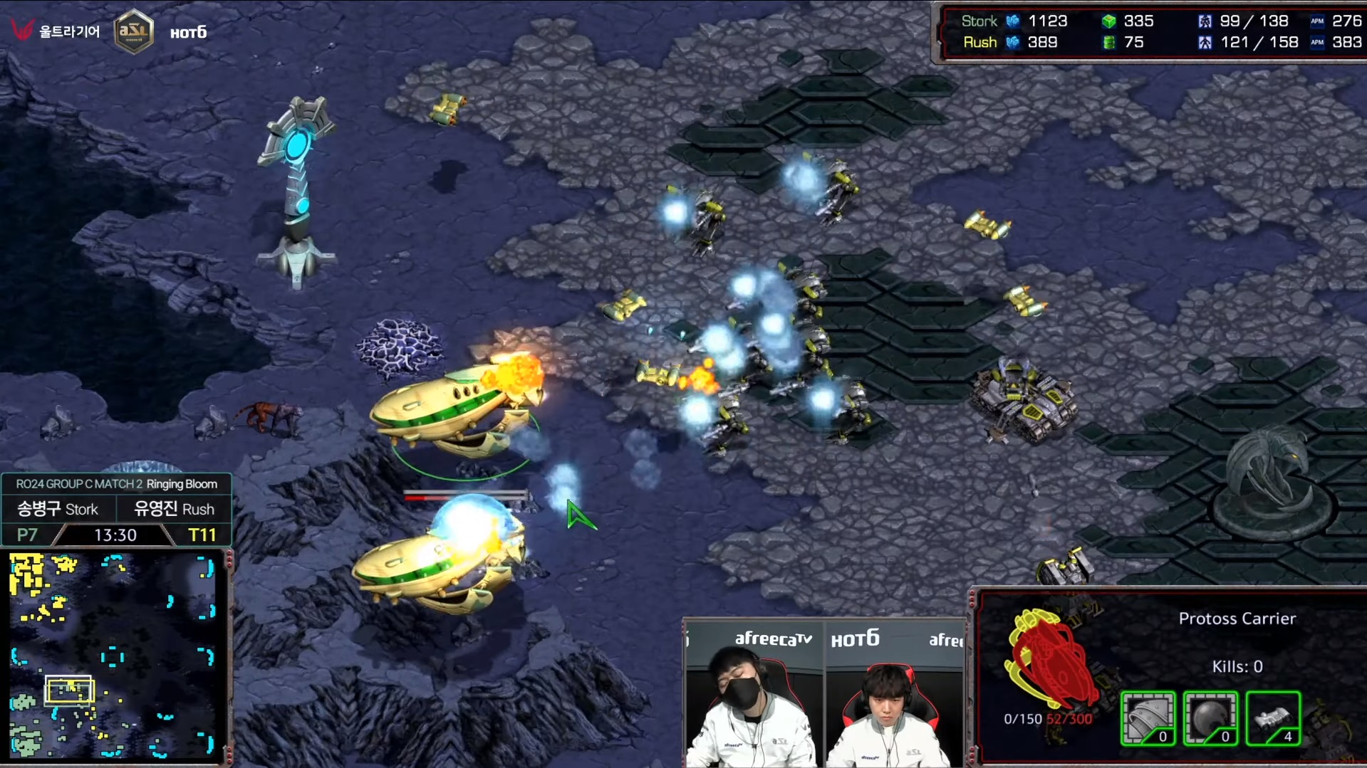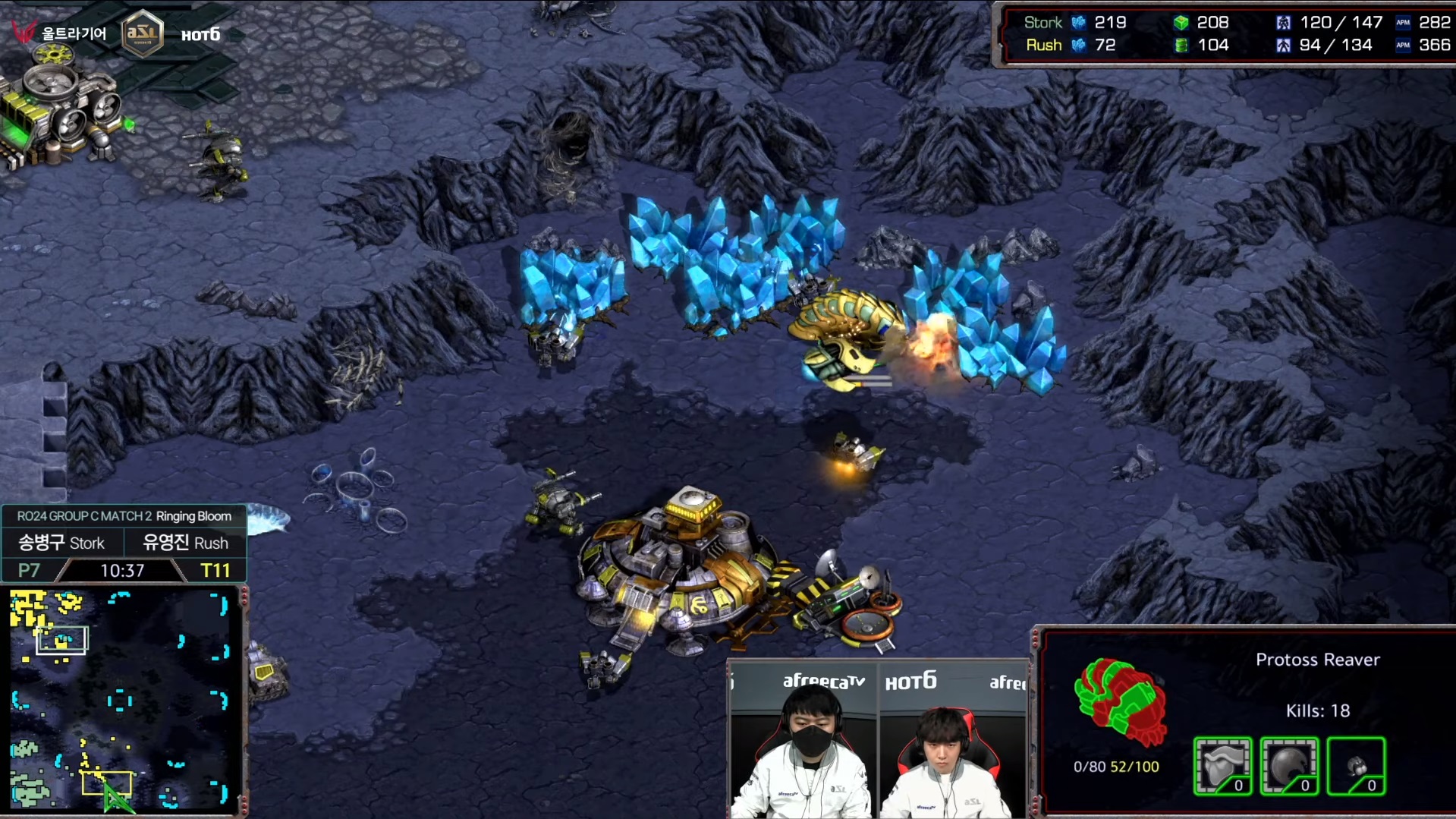 городские центрыЦЦ и нексус. Rush откладывает оппоненту небольшую пакость в минеральной линии экспанда.Stork подстраивает ривера, но хитрый терран строит 4 голиафов до танка и перехватывает шаттл.