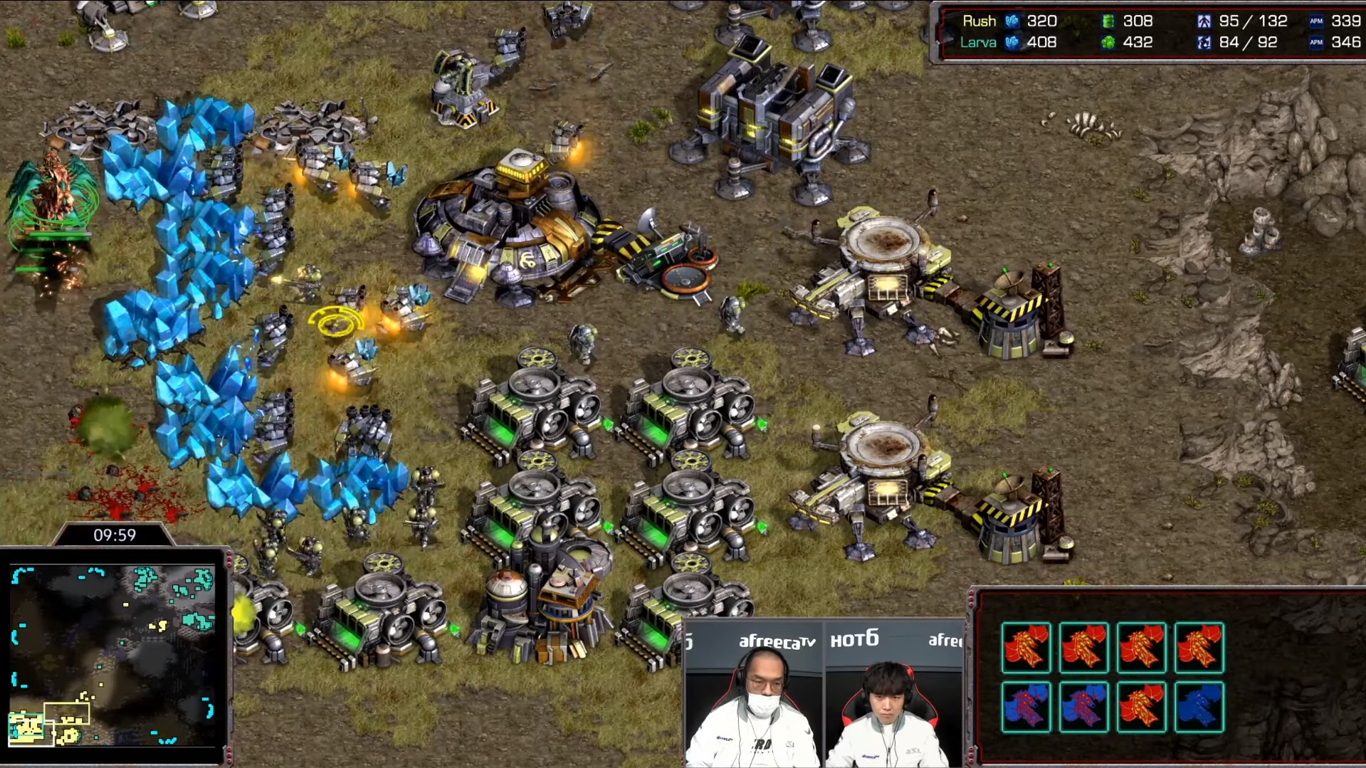 Терран затягивая петлю на шее Лярвы, дропает на мэйн и облучает бочками трутней. Не найдя ключей к победе, зерг сдается.