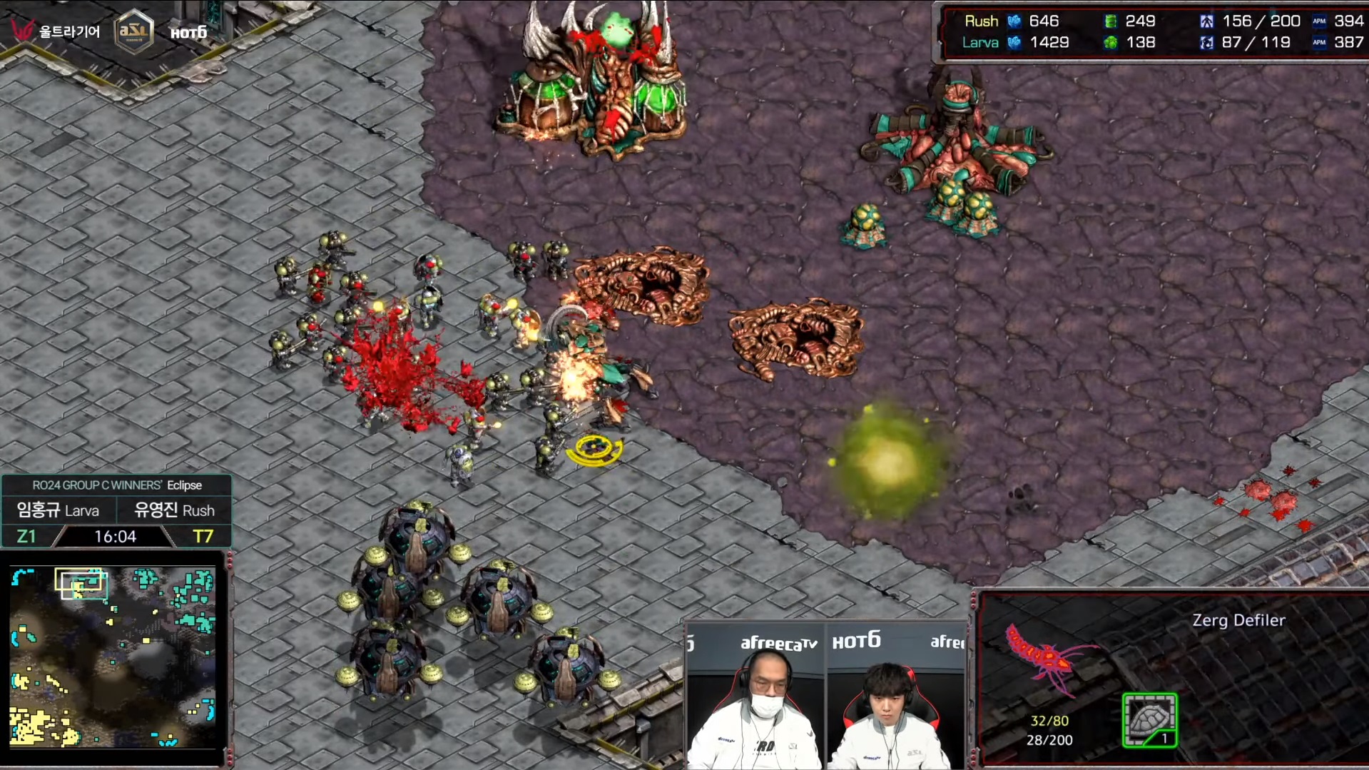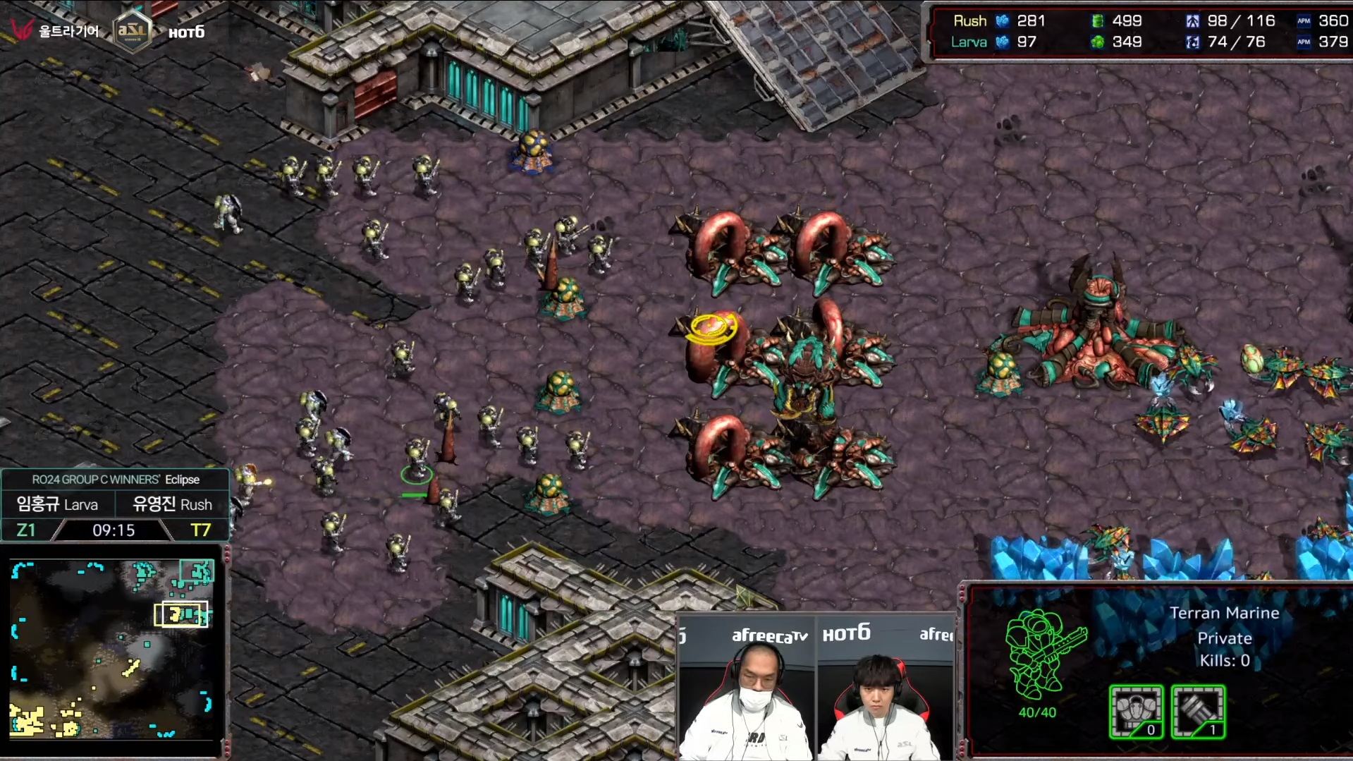 Rush проводит плотную атаку на свежую базу противника. Зерг получил хайвовые технологии, но ультралисков можно было пересчитать по пальцам одной протоссовской руки.
